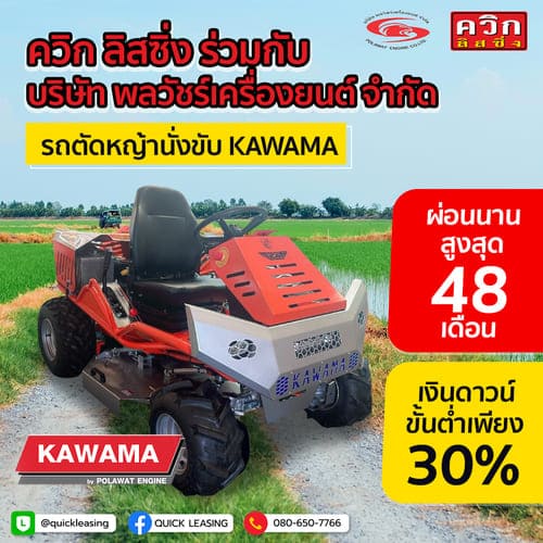 ควิก ลิสซิ่ง ร่วมกับ พลวัชร์เครื่องยนต์ จำกัด จำหน่ายรถตัดหญ้านั่งขับ KAWAMA เพื่อพี่น้องเกษตรกรและท่านที่สนใจอยากเป็นเจ้าของ